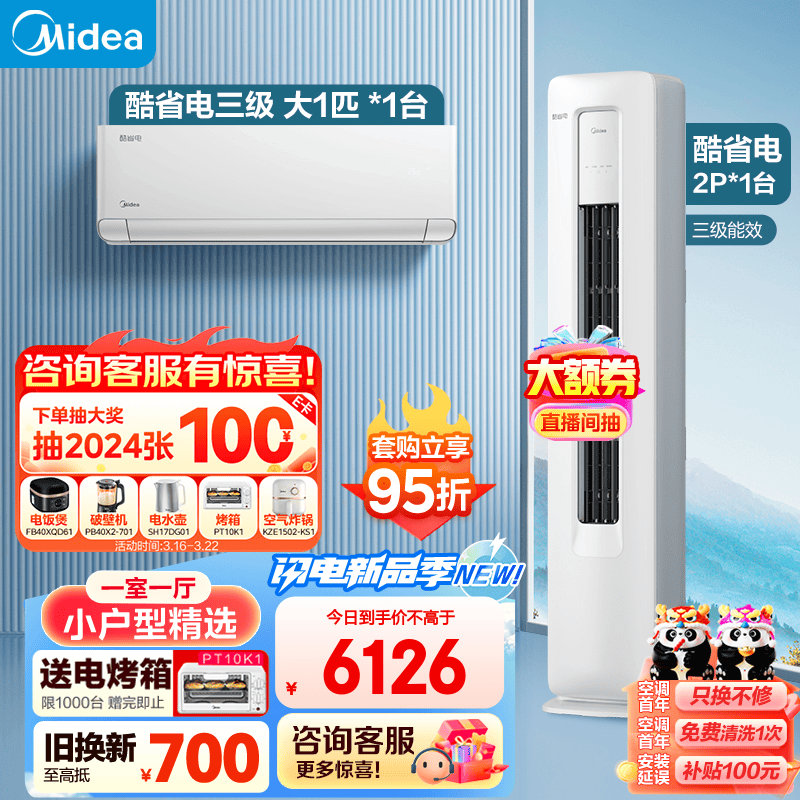 美的(Midea)新能效 酷省电 空调套装 一室一厅 小户型精选(大1酷省电+2匹酷省电)价格:6448.00元!