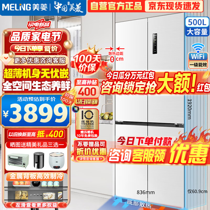 美菱(MeiLing)500升十字对开门冰箱四开门嵌入式一级能效底部散热超薄60.9cm白色双变频净味电冰箱BCD-500WPU9CF价格:4099.00元!