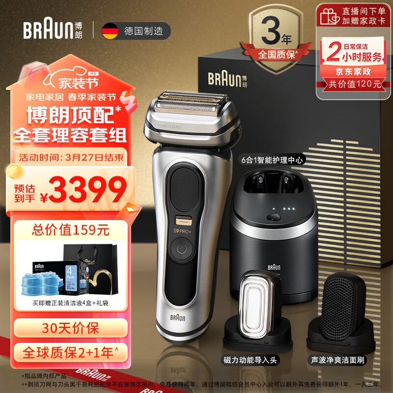 博朗(BRAUN)9系pro+升级版清洁中心多配件礼盒款电动剃须刀整机进口往复式送男友送老公价格:3399.00元!