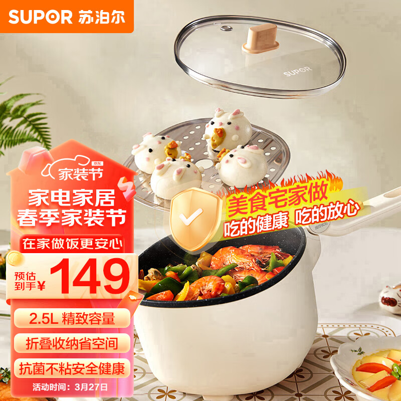 苏泊尔(SUPOR)电炒锅 便携式电煮锅电热锅 多功能宿舍泡面锅电火锅 旅行出差折叠式把手2.5L多用途锅CJ20A819价格:149.00元!