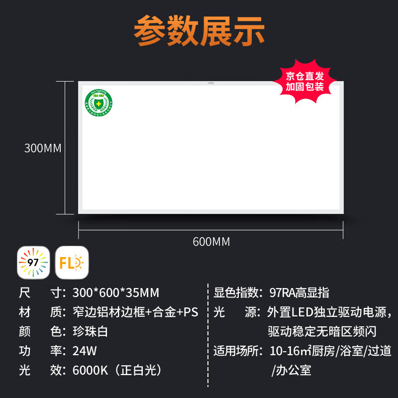 雷士(NVC)厨卫灯LED集成吊顶灯卫生间杀菌除甲醛面板灯窄边高显真彩光24W价格:159.00元!
