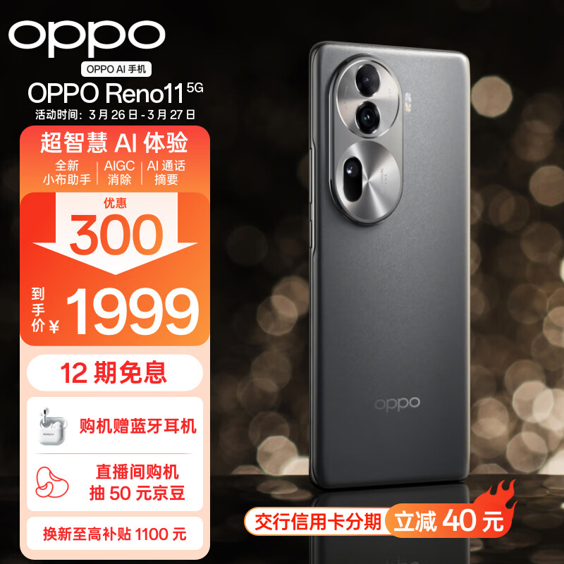 OPPO Reno11 5000万单反级人像三摄 天玑8200 旗舰芯 长续航 8GB+256GB 曜石黑 学生5G拍照 AI智能手机价格:2299.00元!