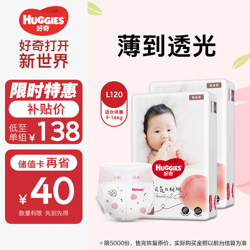 好奇(Huggies)铂金装纸尿裤L120片(9-14kg)大号婴儿尿不湿小桃裤裸感超薄透气价格:138.00元!