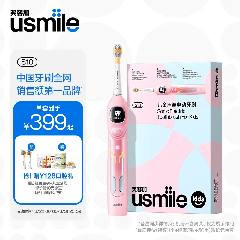 usmile笑容加儿童电动牙刷 AI防蛀智慧屏 菌斑提醒 数字牙刷 S10晴空粉 3-12岁 儿童礼物价格:439.00元!