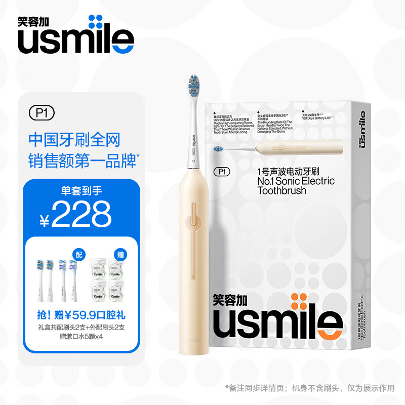 usmile 笑容加 电动牙刷 1号刷 奶油黄+缓震亮白刷头2支装价格:228.00元!