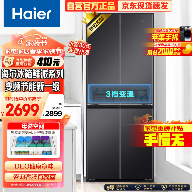海尔(Haier)鲜派系列401升双变频风冷无霜十字双开对开四开多门超薄家用电冰箱一级能效BCD-401WLHTDEDSDU1价格:2699.00元!