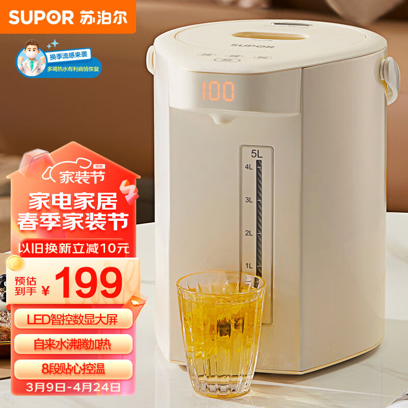 苏泊尔(SUPOR) 电热水瓶热水壶 5L大容量电水瓶八段智能保温恒温304不锈钢 家用电水壶烧水壶SW-50T106价格:199.00元!