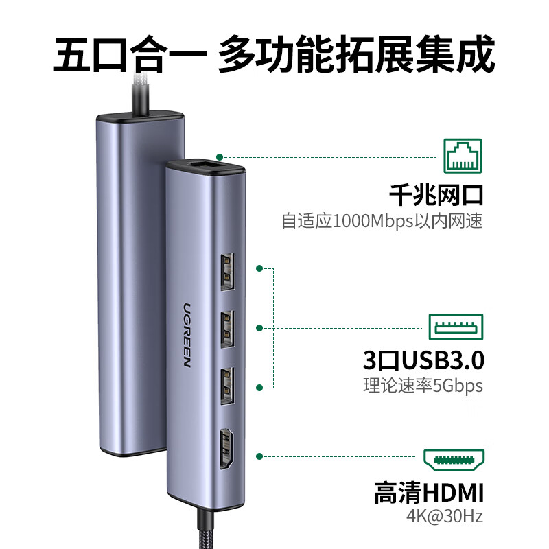 绿联(UGREEN)Type-C扩展坞USB-C转HDMI拓展坞千兆网卡转换器网线口转接头分线器通用苹果15MacBook华为笔记本价格:139.00元!