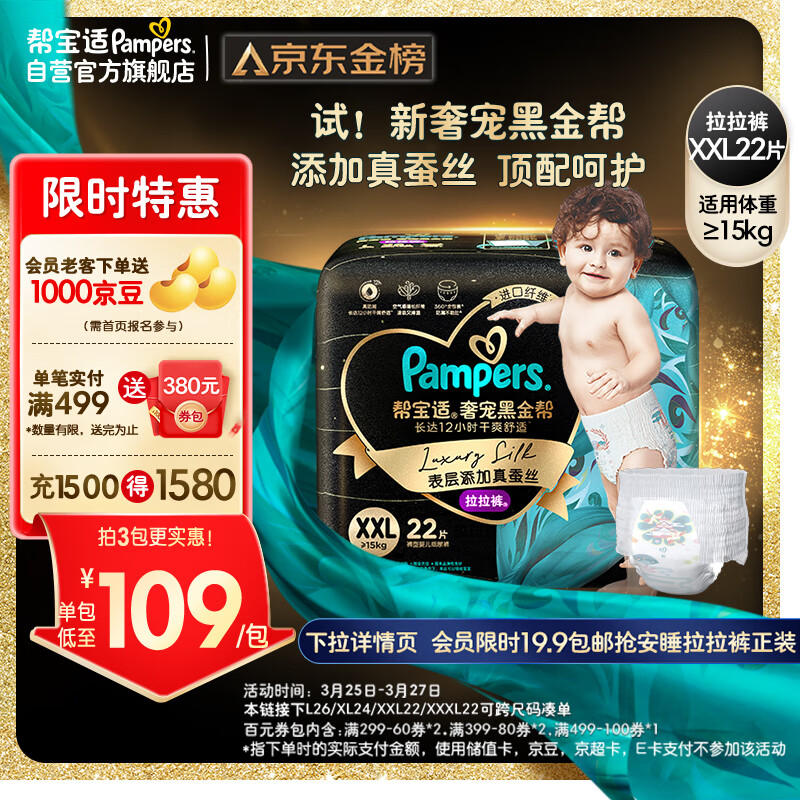 帮宝适黑金帮拉拉裤XXL22片(15kg以上)尿裤尿不湿蚕丝 超薄透气价格:128.20元!