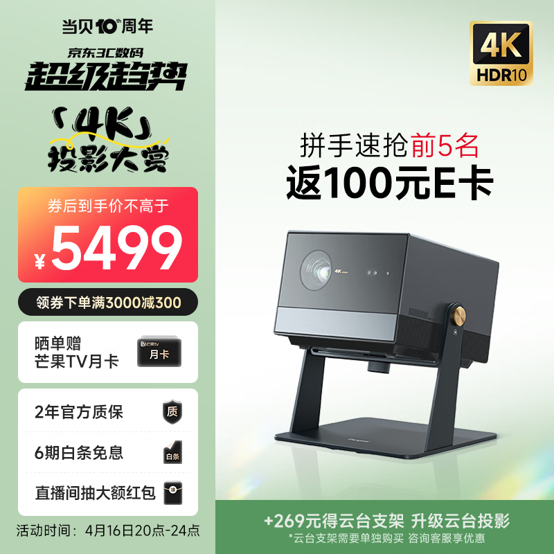 当贝F6 投影仪家用 4K超清 游戏投影 家庭影院(6G 全玻璃镜头 全新海思V811 WiFi6 不虚焦)价格:5799.00元!