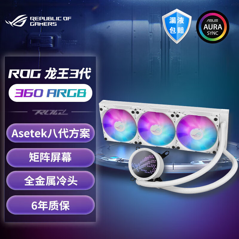 华硕(ASUS)ROG 龙王三代 360ARGB 白色一体式水冷散热器 Asetek八代方案/全金属冷头/矩阵屏幕价格:2599.00元!