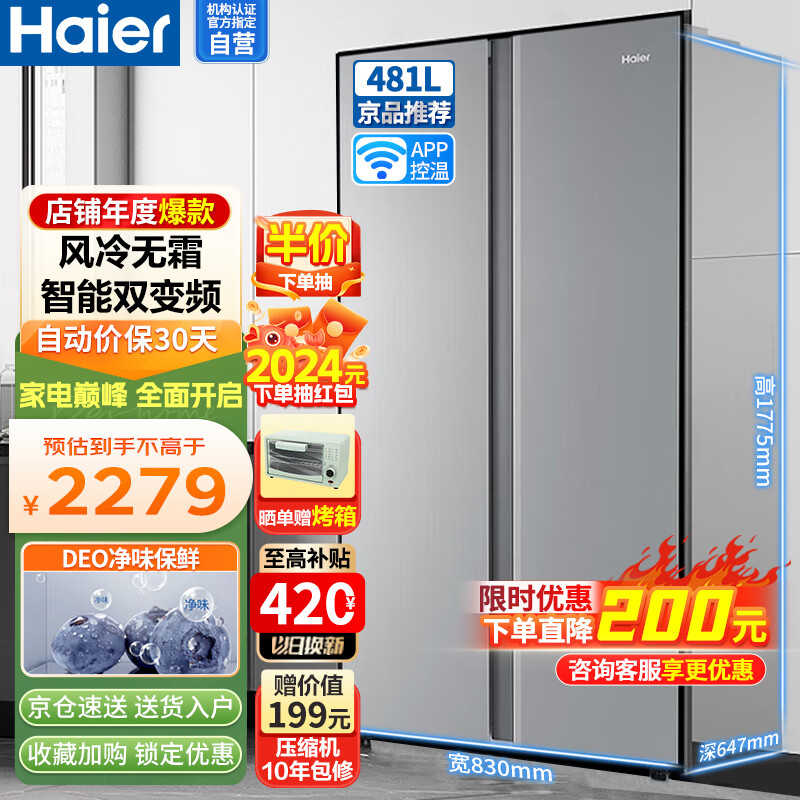 海尔(Haier)冰箱481升对开门双开门大容量风冷无霜节能双变频大冷冻力WIFI控温家用电冰箱BCD-481WGHSSEDS9U1价格:2299.00元!