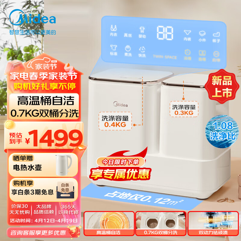 美的(Midea)双子座内衣洗衣机小型全自动分区双桶洗漂脱 双动力电机护衣 高温银离子除菌除螨洗袜子MNB7VA0E价格:1499.00元!