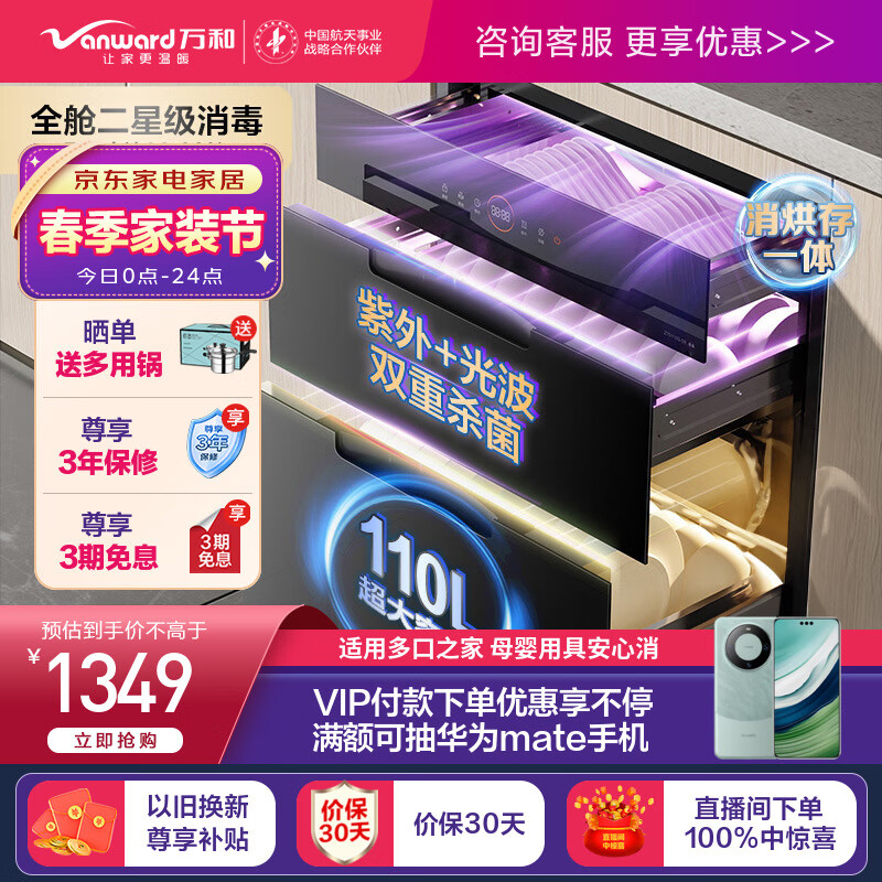 万和(Vanward)消毒柜家用 嵌入式 厨房餐具碗柜碗筷茶杯茶具婴儿奶瓶 紫外线二星消毒 110L三层大容量ZTD110Q-D8价格:1349.00元!