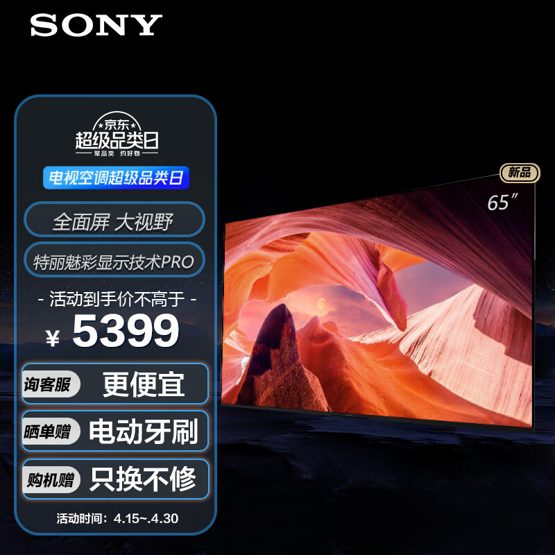 索尼(SONY)KD-65X80L 高色域智能电视 4K HDR 屏设计 黑色价格:5399.00元!