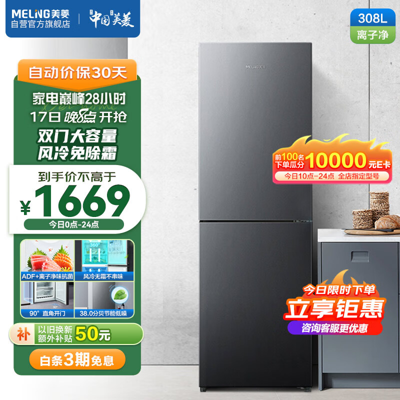 美菱(MELING)【离子净系列】308升双门两门小型电冰箱 家用风冷无霜节能低噪净味大容量 BCD-308WECX价格:1749.00元!