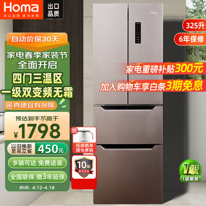 奥马(Homa)325升风冷无霜一级能效双变频法式多门家用超薄电冰箱 三开门四开门 大冷冻抽屉 BCD-325WF/B价格:1798.00元!