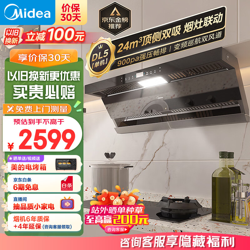 美的(Midea)抽油烟机 家用顶侧双吸 烟灶联动 24风量大吸力 变频 超薄近吸 7字型排油烟机 DL5价格:2599.00元!
