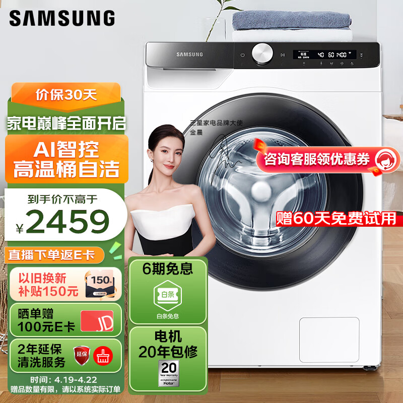 三星(SAMSUNG)10.5公斤滚筒洗衣机 蒸汽除菌 高温桶自洁 15分钟快洗 泡泡净洗10公斤洗衣机WW10T504DAE/SC 白价格:2459.00元!