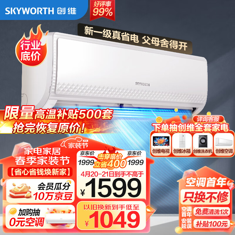 创维空调大1匹新一级能效 畅享风 自清洁空调挂机 变频冷暖卧室 以旧换新KFR-26GW/V3GB1B-N1价格:1549.00元!