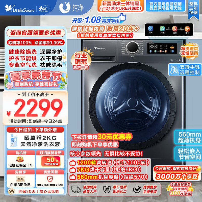 小天鹅(LittleSwan)滚筒洗衣机全自动 洗烘一体洗衣机【TD100APURE】深层除菌螨 蒸汽速烘 10公斤 以旧换新 家用价格:2299.00元!
