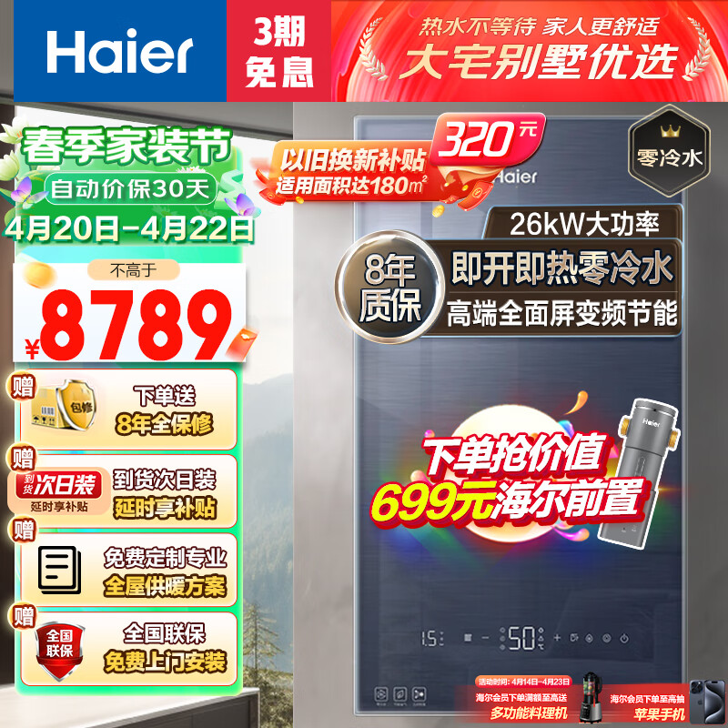 海尔(Haier)增压零冷水燃气壁挂炉天然气采暖炉热水器家用板换式地暖暖气片锅炉变频风机L1PB26-JR3(T)U1价格:8789.00元!
