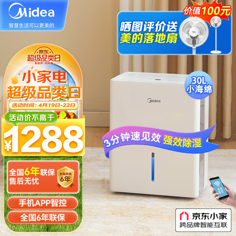 美的(Midea)除湿机/抽湿机 京东小家智能生态 小海绵除湿机/除湿量30升/天 家用轻音app智控CF30BD/N7-DP5价格:1258.00元!