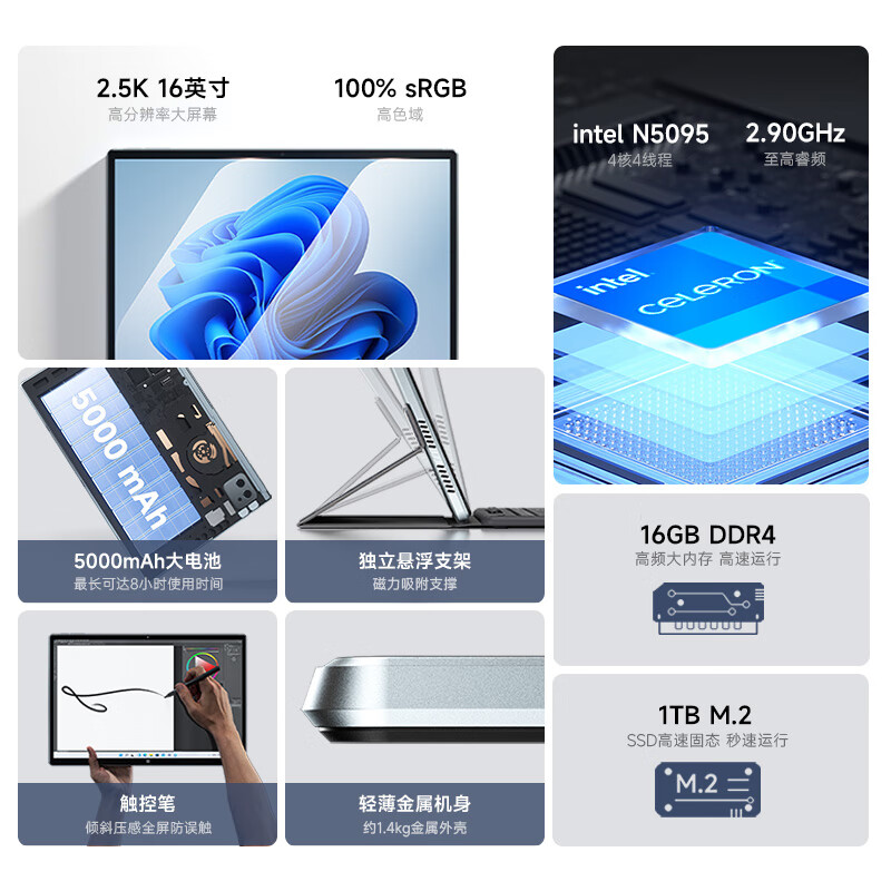 戴睿(dere)黑科技16英寸大屏笔记本电脑平板二合一触控摸金属商务办公学生教育轻薄便携游戏 16G+1TB 卷云灰价格:2998.00元!