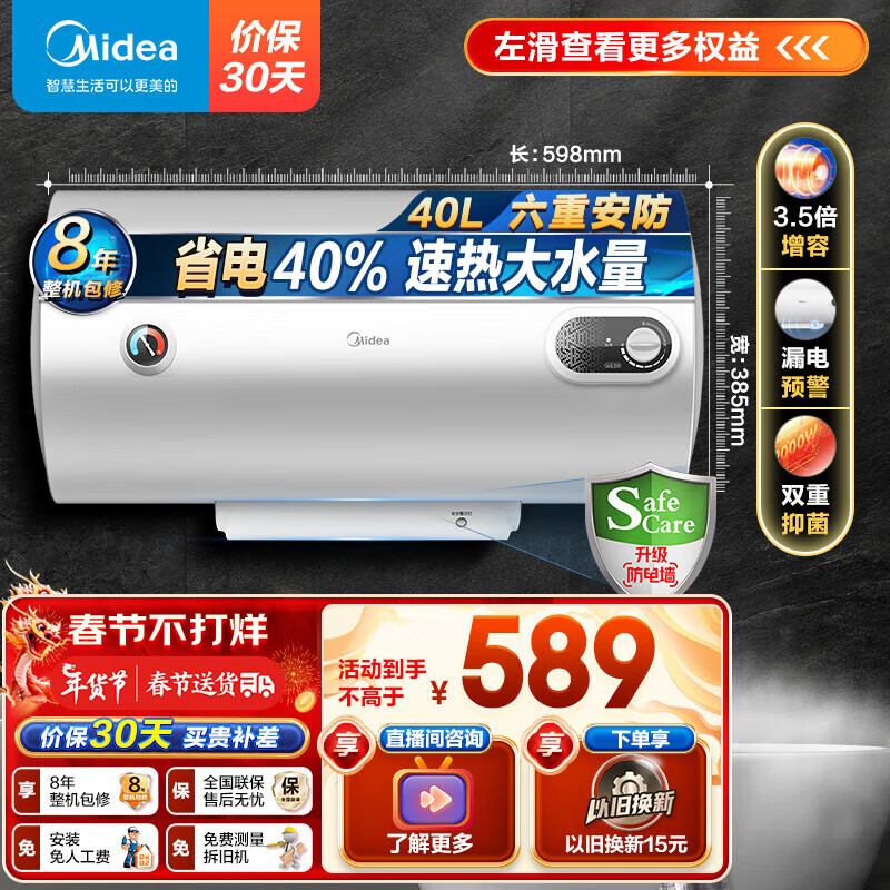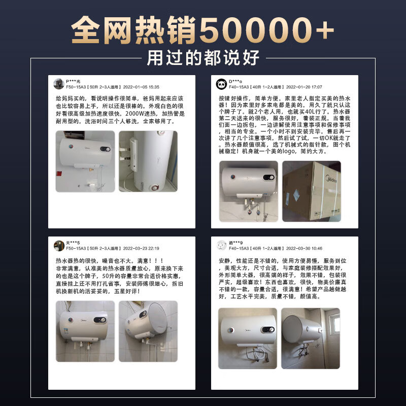 美的(Midea)储水式电热水器家用出租房节能省电健康洗浴小型储水式洗澡A3加长防电墙 F40-15A3【40升 1-2人适用】价格:669.00元!