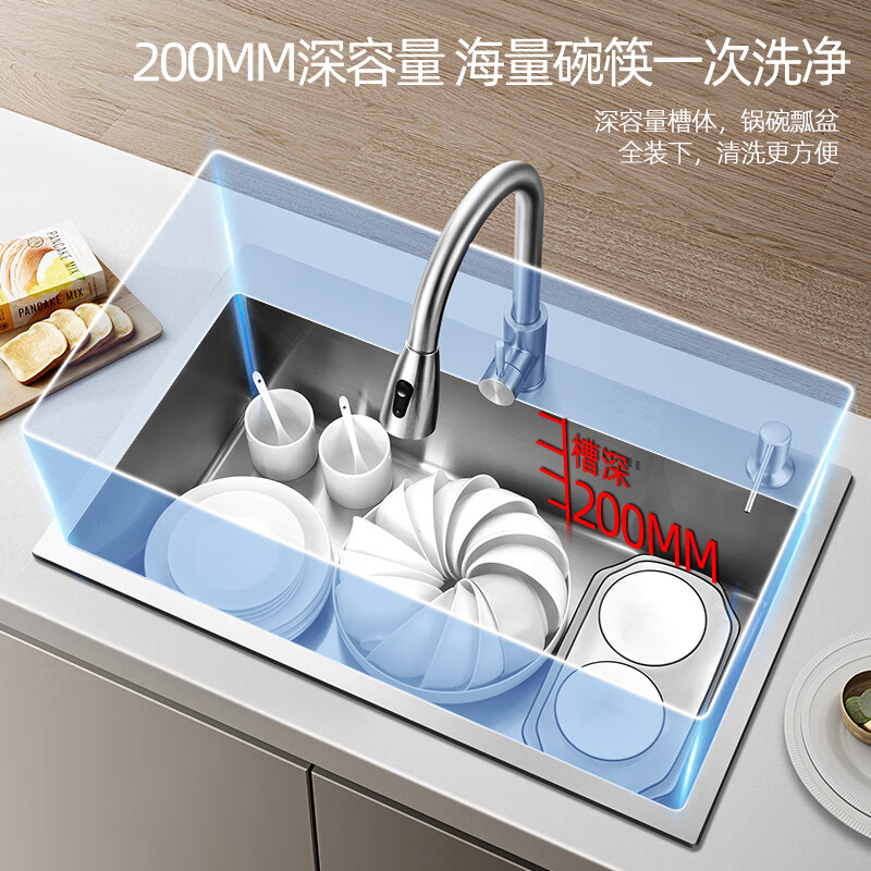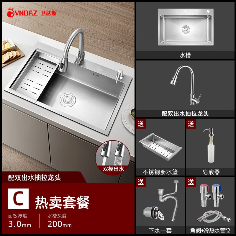 卫达斯厨房洗菜盆一体盆厨房水池盆不锈钢水槽大单槽台下盆洗菜池洗碗槽 75*45cm配冷热抽拉龙头价格:478.00元!