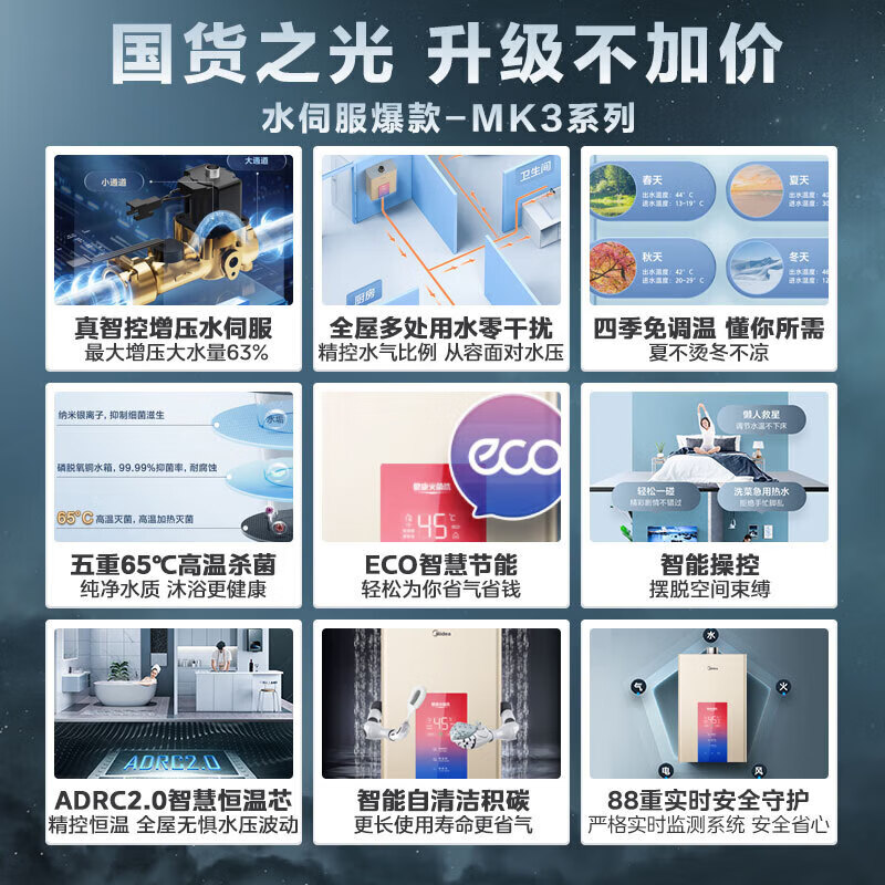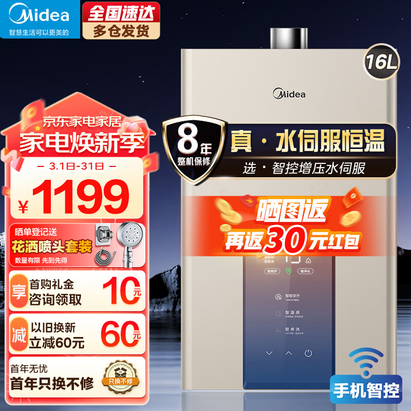 美的(Midea)燃气热水器16升天然气智控增压水伺服恒温节能多点用水零干扰智能自清洁JSQ30-MK3价格:1199.00元!