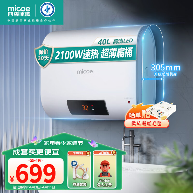四季沐歌(MICOE)电热水器温度数显超薄储水式40L 速热2100W 家用扁桶适用1-2人 M3-S40-21-BH1价格:699.00元!