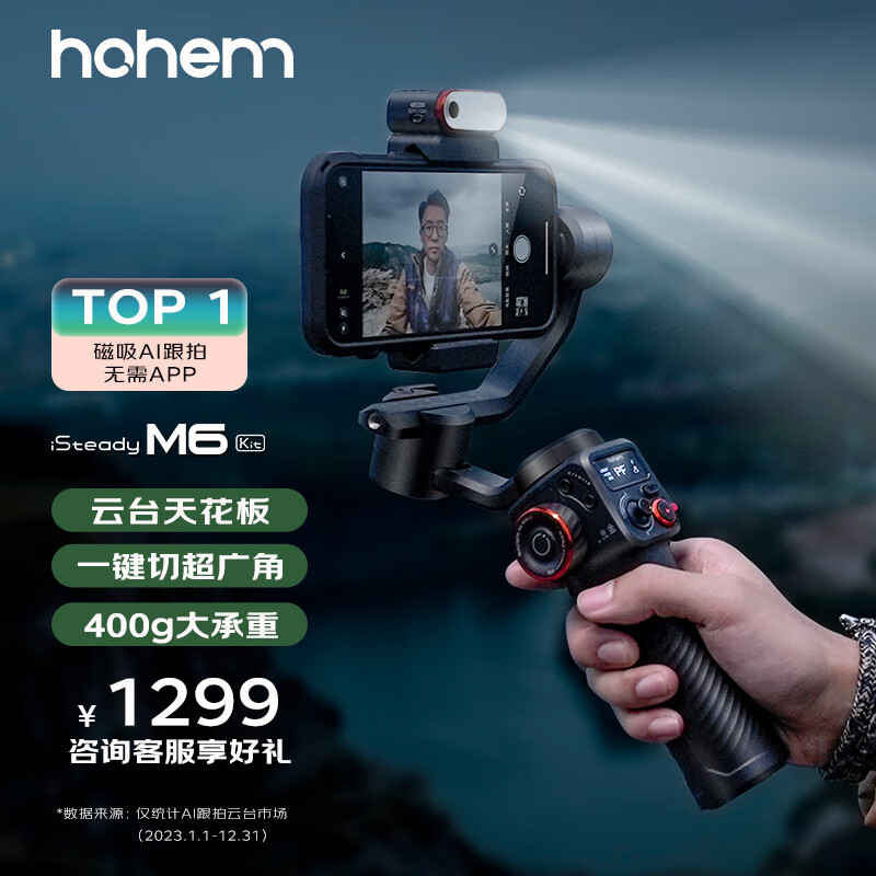 浩瀚(hohem)M6 kit 云台稳定器 手机稳定器 手机云台 专业三轴防抖云台稳定器 无死角运镜 俯仰335°大角度价格:1459.00元!
