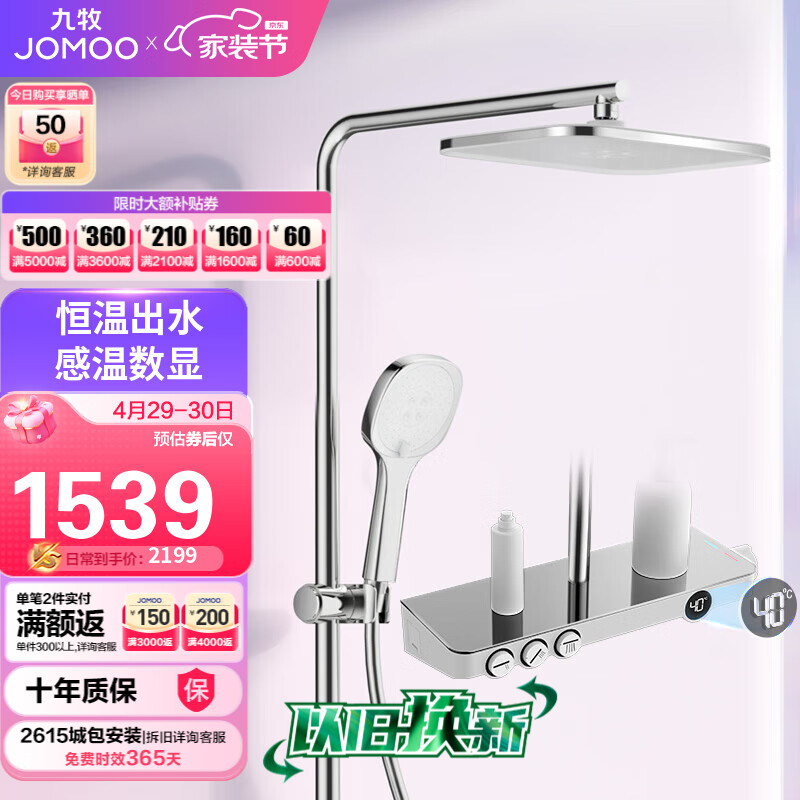 九牧(JOMOO)数显恒温淋浴花洒套装置物架增压除垢淋浴器 26177-624/KB-1价格:1999.00元!
