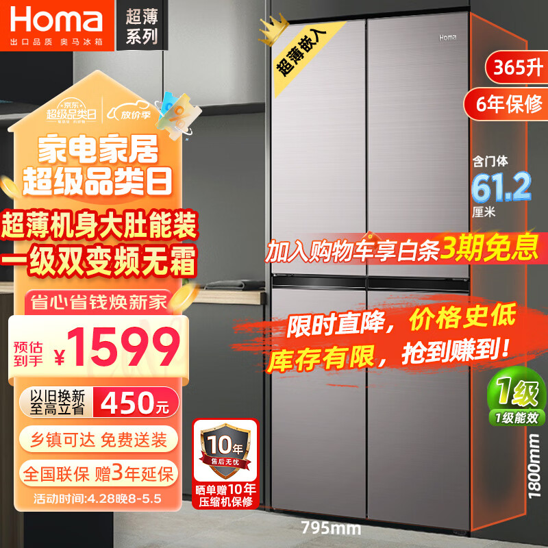 奥马(Homa)超薄冰箱365升风冷无霜一级能效双变频十字对开门双开门四门家用薄款电冰箱BCD-365WDK/B价格:1599.00元!