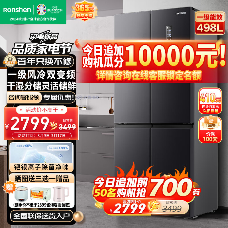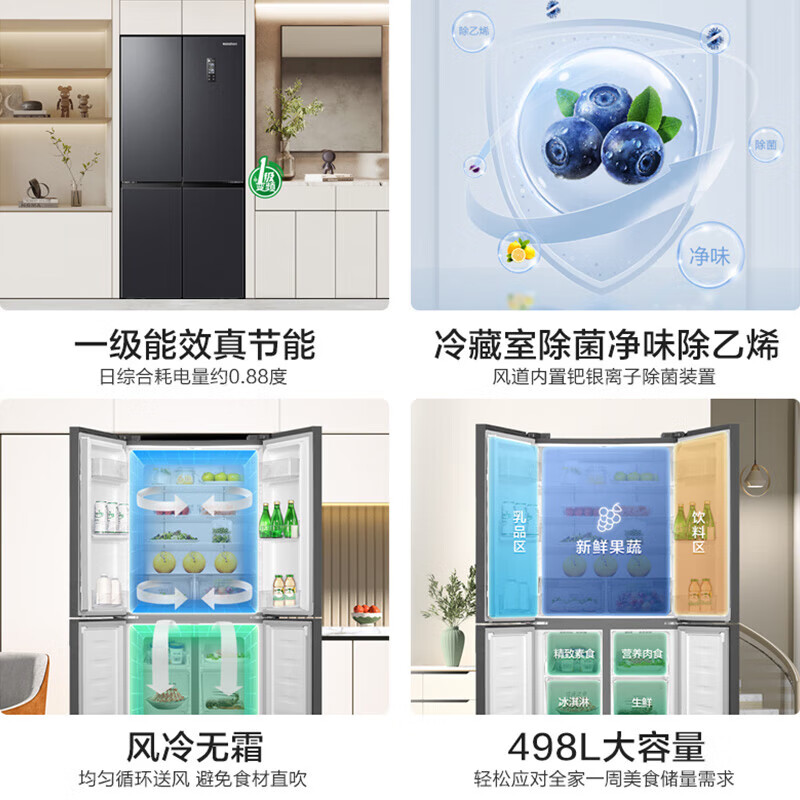 容声(Ronshen)498升十字对开门家用一级双变频双循环防串味风冷无霜超薄嵌入式大容量四开门电冰箱BCD-498WD11FP价格:3499.00元!