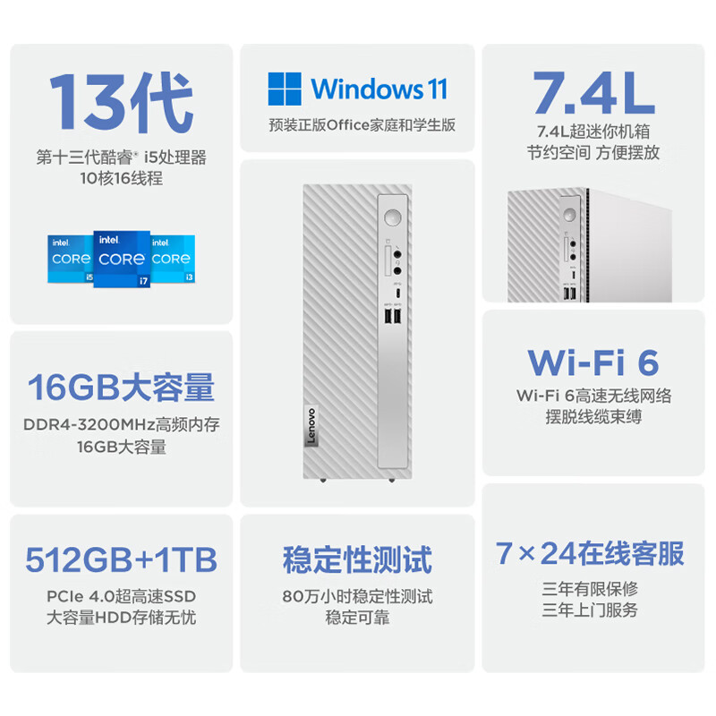 联想(Lenovo)天逸510S 个人商务台式机电脑主机(13代i5-13400?16G 1TB HDD+512G SSD wifi win11 )来酷27英寸价格:4499.00元!