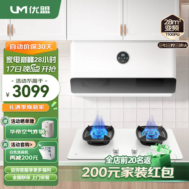 优盟(UM)白色油烟机灶具套装超薄近吸烟机小尺寸28风量家用变频大吸力油烟机燃气灶烟灶套装自动清洗天然气价格:3099.00元!