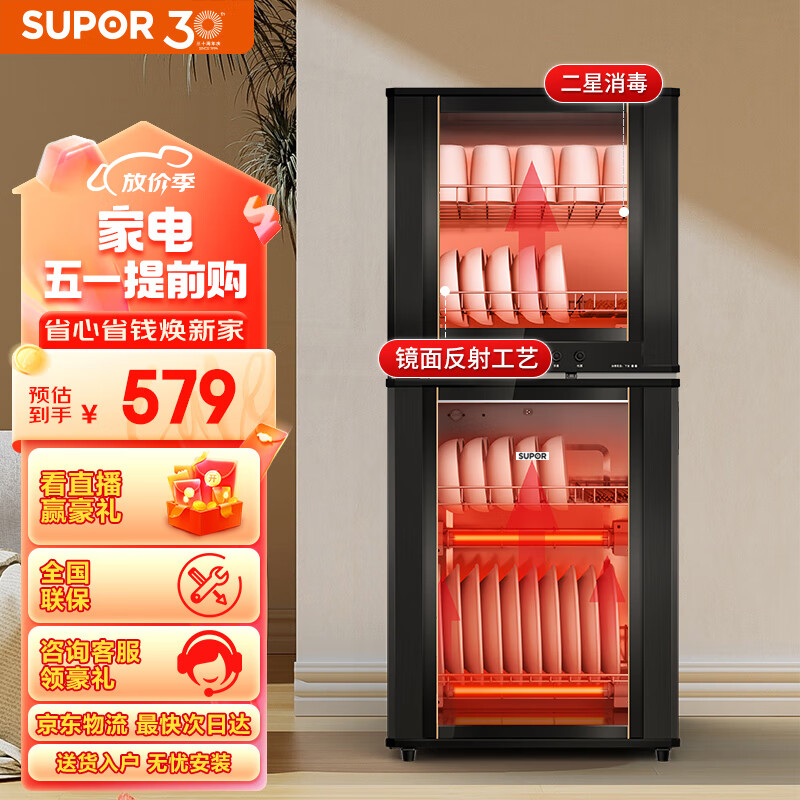 苏泊尔(SUPOR) 消毒柜家用立式 消毒碗柜大容量 高温餐具茶杯碗筷消毒厨房柜100L RLP100G-L06价格:579.00元!