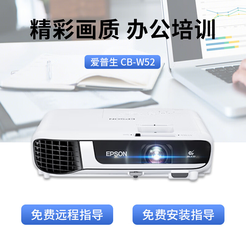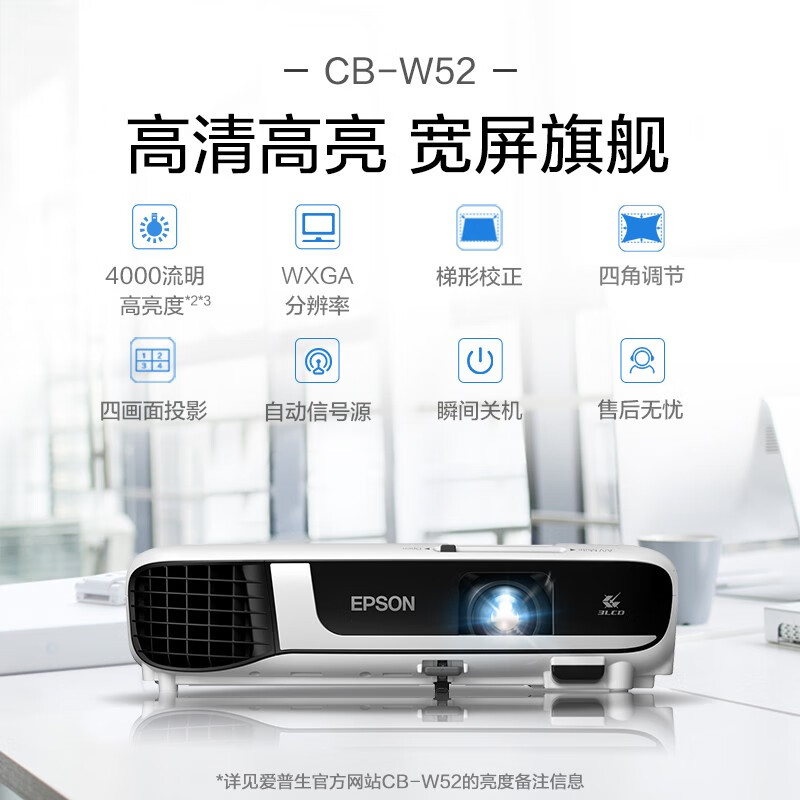 爱普生(EPSON) CB-W52 投影仪 投影机办公 培训(高清宽屏WXGA 4000流明 手机同屏 支持侧投)价格:5299.00元!