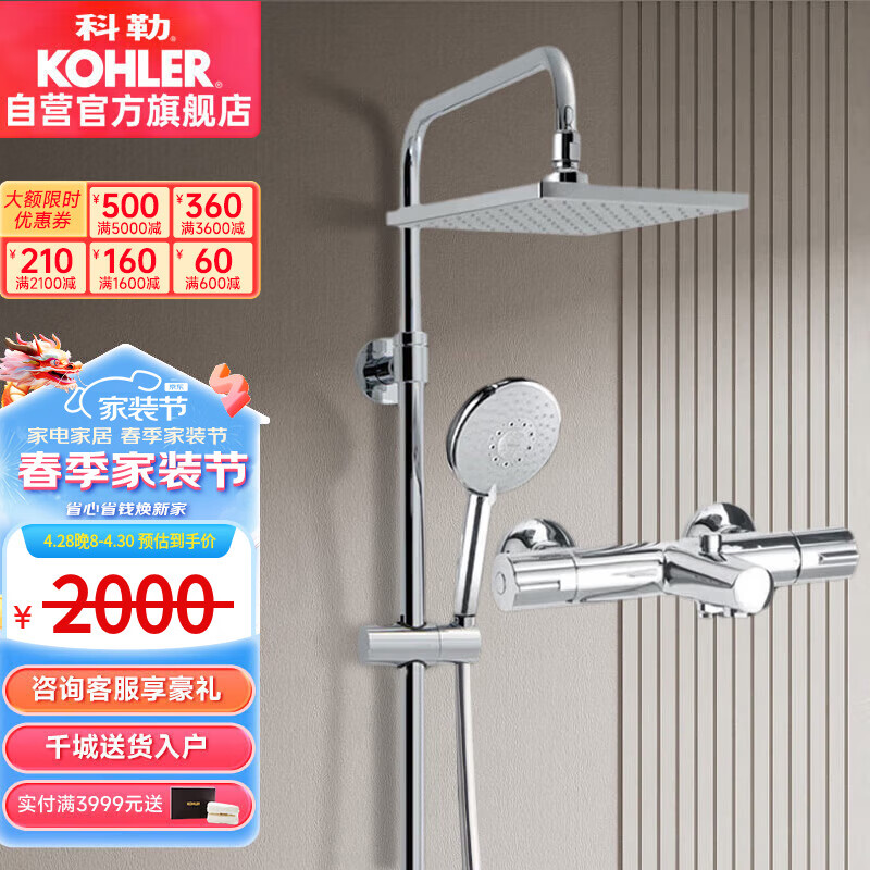 科勒(KOHLER)恒温花洒可升降淋浴器花洒套装三出水恒温淋浴柱 方形顶喷 26470价格:2499.00元!