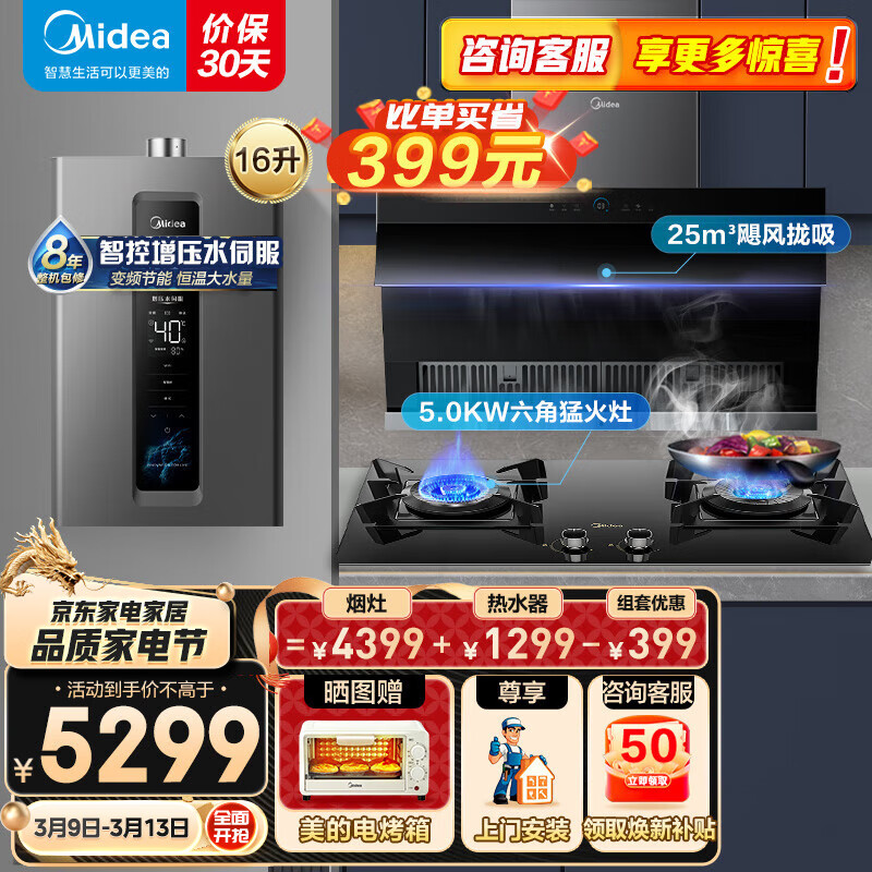 美的(Midea)顶侧双吸7字型排油烟机烟灶多件套装燃气热水器家用烟灶燃热厨房三件套AC7+Q70+16RF3天然气价格:5299.00元!