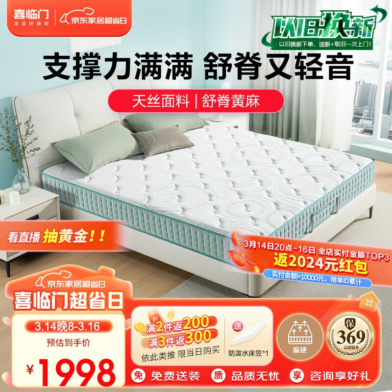 喜临门抑菌防螨床垫 3D黄麻独袋弹簧偏硬床垫 光年护脊3.0 1.8x2米价格:1998.00元!