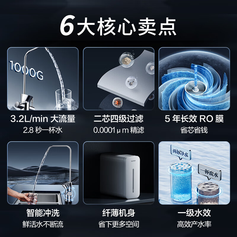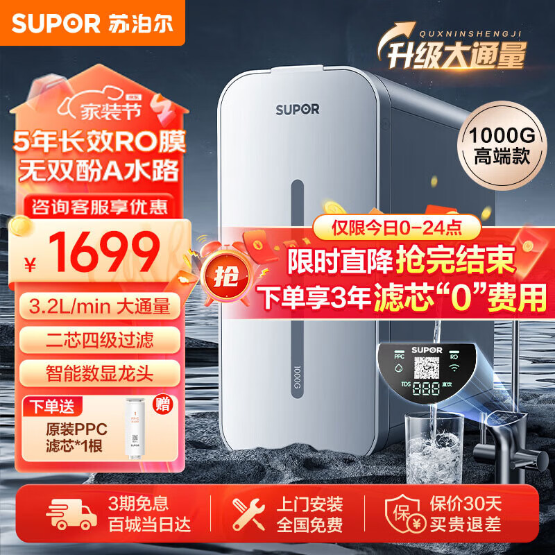 苏泊尔(SUPOR)净水器家用直饮机净水机RO反渗透纯水机1000G大通量过滤器UR100滤水器厨下净水机价格:1699.00元!