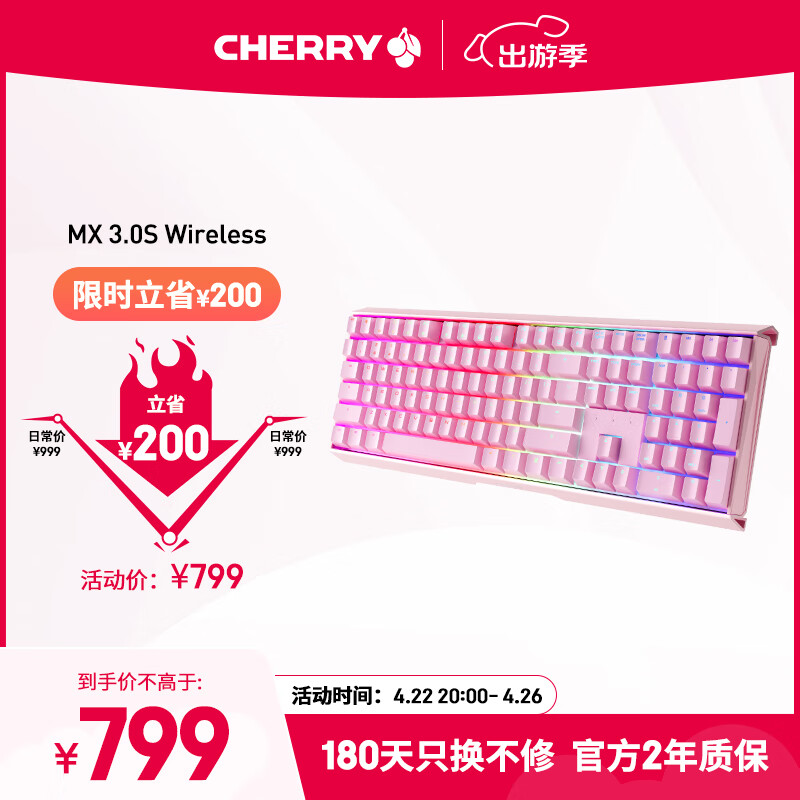CHERRY樱桃 MX3.0S无线键盘 机械键盘 游戏键盘 电脑键盘 蓝牙有线三模 RGB灯效 铝合金外壳 粉色红轴价格:999.00元!