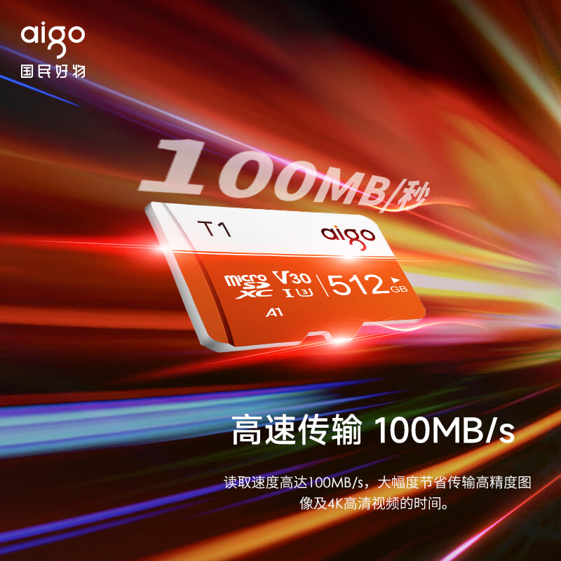 爱国者(aigo)512GB TF(MicroSD)存储卡 U3 A1 V30 4K内存卡 相机行车记录仪监控摄像头储存卡 T1读速100MB/s价格:259.00元!