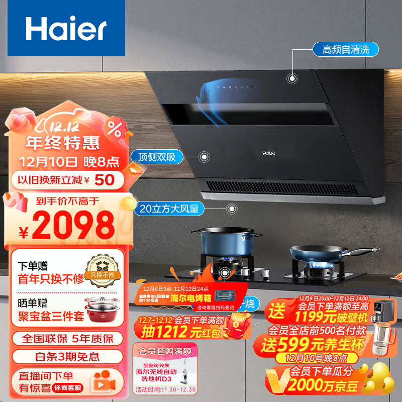 海尔(Haier)抽油烟机 顶侧双吸厨房烟灶套装 20m3/min大吸力 家用侧吸式油烟机灶具套装C6JS+9B1天价格:2098.00元!