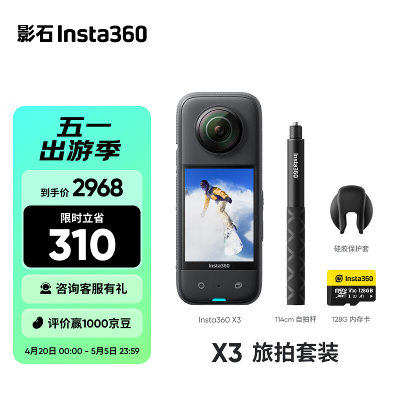 Insta360影石 X3全景运动相机防抖相机5.7K高清360全景摄像机摩托车vlog滑雪(旅拍套装)价格:2958.00元!