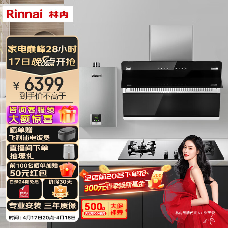 林内(Rinnai)油烟机燃气灶热水器套装 22立方 大吸力智能定时烟灶三件套 NM09J+2E07MT+13QC05 以旧换新价格:6399.00元!