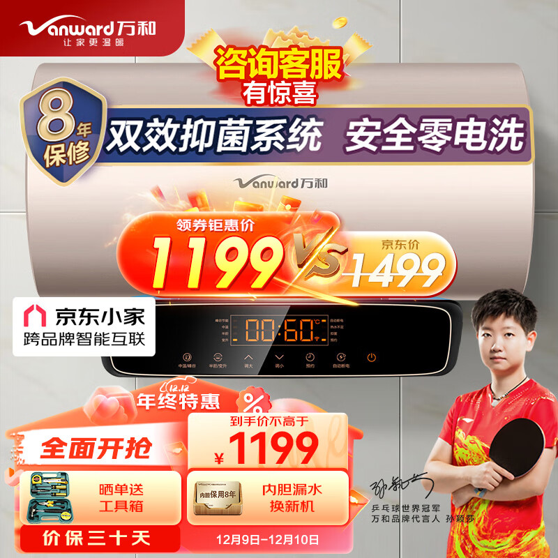 万和(Vanward)80升电热水器京东小家智能生态 一级能效七倍增容智能断电双管速热高温杀菌E80-Q7WW10-20价格:1499.00元!